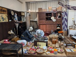① 伊吹山文化資料館(1) かまどや石臼などが展示されています。 左には洗濯板やたらい、中央奥には五右衛門風呂も見えます。 |
