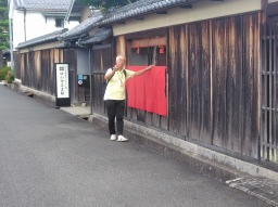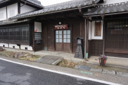 ①近江日野商人ふるさと館「旧山中正吉邸」(1) (蒲生郡日野町西大路) 午前中の講義が行われた近江日野商人ふるさと館「旧山中正吉邸」の玄関付近を撮った写真です。赤い毛氈が掛かっているところが日野の商家によく見られる「桟敷窓」で、5月3日の日野祭の曳山巡行を見物できるようになっています。 |