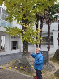 ⑥ 大銀杏(2) 昭和62年(1987年)に創立百周年記念として建てられた碑です。(写真⑤の粕渕先生の後ろにある碑の拡大写真です。) |
