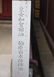 ⑦ 柏原宿本陣跡 参勤交代の大名、公家や旗本などが宿泊したり休憩するために設置された本陣の跡です。 皇女和宮が徳川家茂と婚姻のため江戸へ向かう際にここに宿泊されました。 |