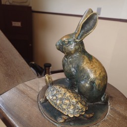 ⑥ 豊郷小学校旧校舎(2) 階段の手すりには、うさぎとかめの真鍮像があしらわれています。 イソップ童話のウサギとカメの話を元に作られており、この写真の1階の手すりでは両者がスタートラインに立っていますが、階段の途中にはゆっくり登るカメが、階段の踊り場では余裕を見せて寝ているウサギが、そして2階の手すりには先にゴールしたカメがあしらわれています。 |