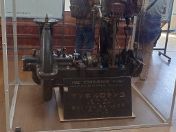 ⑧ 豊郷小学校旧校舎(4) 豊郷町内には、明治43年(1910年)に完成した日本で最初の蒸気機関動力ポンプによる地下水汲み上げ施設である「龍ヶ池揚水機場」があります。令和6年(2024年)に世界かんがい施設遺産に登録されました。 旧豊郷小学校内には、同揚水機場で当時使われていたイギリス製の蒸気機関動力ポンプが展示されています。 |