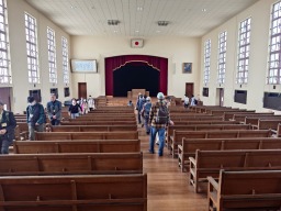 ⑦ 豊郷小学校旧校舎(3) 講堂です。高い天井と採光を考えた高窓、それに前にいくほど低くなる傾斜がついた板張りの床と木製の長椅子。教会を思わせるような雰囲気です。 |