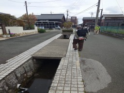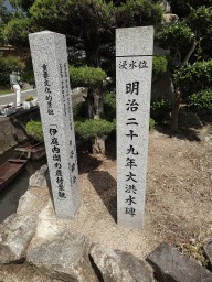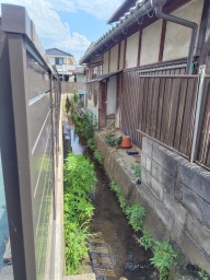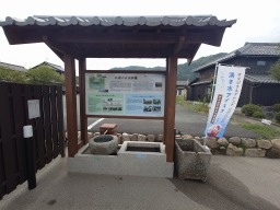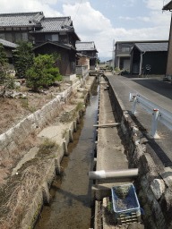 ⑤ 大溝陣屋 大溝の古式水道 分部氏は、総門から南側に陣屋や武家屋敷などの武家地を、北側を町人地として区画しましたが、町人地では酒造業をはじめ様々な商いが行われました。また、飲水のため上水道(古式水道)が整備されました。写真の左が山水で武家地に引かれ、その右隣が湧水で町人地に引かれました。所々にタチアガリと呼ばれる施設を作り、各家に引き入れられました。上水道が整備された現在においても古式水道は地域で利用されています。 |