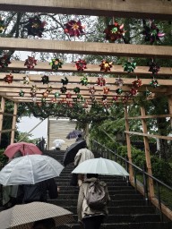 ② 西教寺(2) 参道 総門から勅使門まで続く参道は、桜や紅葉など四季折々の風情が楽しめます。校外学習当日はあいにくの天気でしたが、雨に濡れた青紅葉にきらきら輝く風車が映えていました。 |