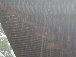 ⑨ 日吉大社(3) 西本宮楼門 猿の彫刻 大雨のためかすんで見にくいですが、楼門の四隅の棟木には「棟持ち猿」と呼ばれる「神猿(まさる)」が彫刻されています。「神猿」は神様のお使いとされ、「魔が去る、何よりも勝る」として縁起の良いものとされてきました。 |
