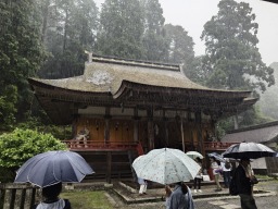 ⑬ 日吉大社(7) 東本宮本殿(国宝) 東本宮本殿は、文禄4年(1595年)に建てられ、桁行五間、梁間三間、妻入、桧皮葺で、西本宮本殿と同様に日吉造となっています。福吉先生から、西本宮本殿との違いについて、東本宮本殿は、建物の背面の縁高欄が背面の内陣部分で一段高くなり、内陣が中核的空間であること、また、建具に蔀戸(しとみど)、窓に横連子(よこれんじ)を用いる点などは、神殿造の特徴であり古式を重んじるものであると教えていただきました。 |