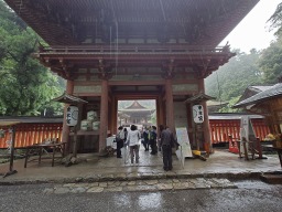 ⑫ 日吉大社(6) 東本宮楼門(重要文化財) 東本宮は、楼門・拝殿・本殿の軸線と直角に近い角度で樹下宮(じゅげぐう)の軸線が交わる特徴を持つと福吉先生から教えていただきました。 東本宮の楼門は、天正から文禄2年(1573年~1593年)頃に建てられ、入母屋造、桧皮葺の三間一戸楼門です。 |