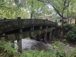 ⑭ 日吉大社(8) 二宮橋(重要文化財) 大宮川に架かる二宮橋、走井橋、大宮橋は、「日吉三橋」と呼ばれています。日吉大社東受付近くにある二宮橋は、豊臣秀吉が寄進したと伝えられる木橋でしたが、寛文9年(1669年)に現在の石橋に架け替えられました。少しアーチ状に反っており、川の中に円柱の橋脚を建て、その上に桁を置き、桁上に継ぎ材を並べて橋板を渡し、両側に高欄をつけています。 |
