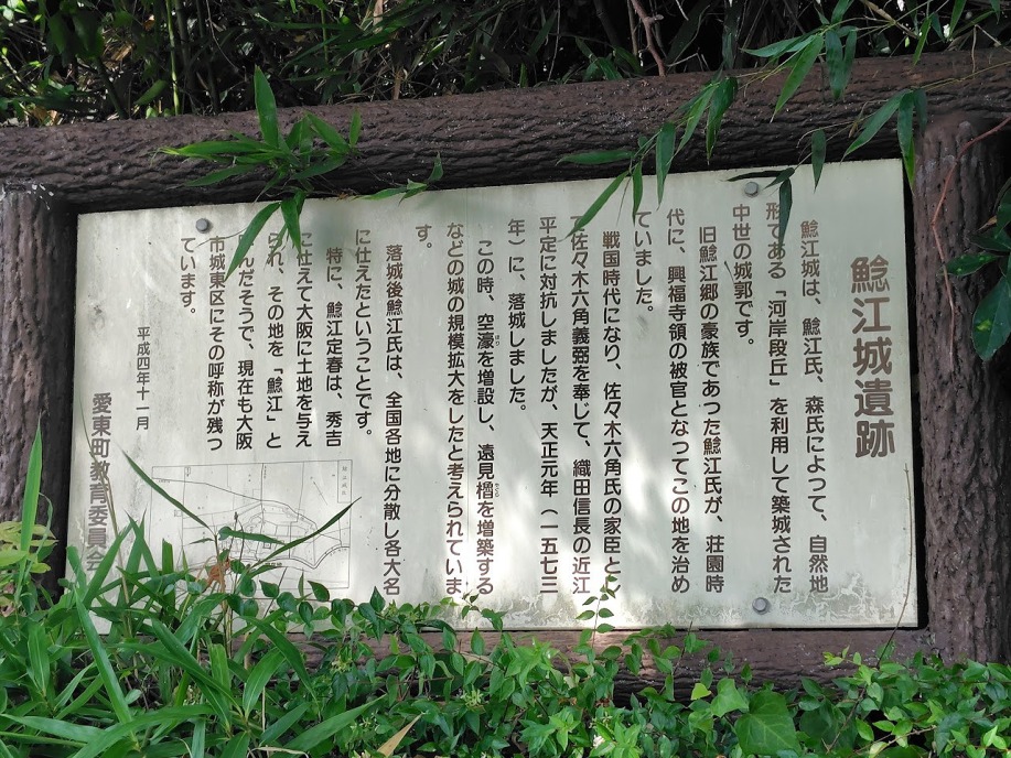 | ⑳鯰江(森村)城址(13) 鯰江城址案内板 (東近江市鯰江町) 石碑の右の方には、鯰江城遺跡の案内版があり、そこには次のように書かれています。 【鯰江城遺跡】 鯰江城は、鯰江氏、森氏によって、自然地形である「河岸段丘」を利用して築城された中世の城郭です。 旧鯰江郷の豪族であった鯰江氏が、荘園時代に、興福寺領の被官となってこの地を治めていました。 戦国時代になり、佐々木六角氏の家臣として佐々木六角義弼を奉じて、織田信長の近江平定に対抗しましたが、天正元年(1573年)に、落城しました。 この時、空濠を増設し、遠見櫓を増築するなど城の規模拡大をしたと考えられています。 落城後鯰江氏は、全国各地に分散し各大名に仕えたということです。 特に、鯰江定春は、秀吉に仕えて大阪に土地を与えられ、その地を「鯰江」と呼んだそうで、現在も大阪市城東区にその呼称が残っています。 平成4年11月 愛東町(注:現東近江市)教育委員会 ※ 写真をクリックすると拡大画像を見ることができます。 |