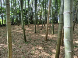 ㉒鯰江(森村)城址(15) 土塁址 (東近江市鯰江町) 竹藪の向こうは水田が拡がっており、竹藪と水田の境界も土塁が続いています。 |