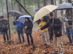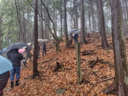 ③ 尾根頂部を目指して 尾根頂部にある後円部を目指し、小雨が降る中落ち葉が積もる道なき道を登っていきます。 |