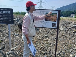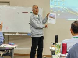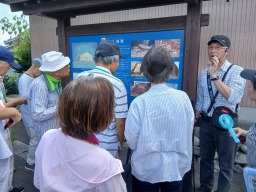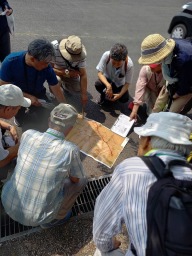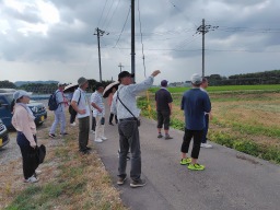 ⑨鯰江(森村)城址(2) (東近江市鯰江町) 山本先生から鯰江城跡案内板を使って発掘調査の状況などについて説明をしていただきました。 |