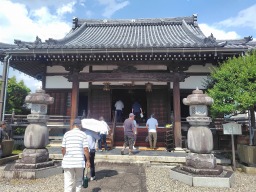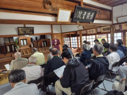 ③ 西教寺(3) 本堂(重要文化財) 本堂は、比叡山焼き討ちで焼失しましたが、元文4年(1739年)に再建されました。講師の県文化財保護課の長谷川聡子先生から、建物の構造形式、本堂の背面側に裏堂が取り付く凸字型の造りであること、屋根、彩色を施した柱、欄間などの特徴について説明を受けました。 |