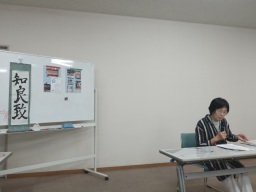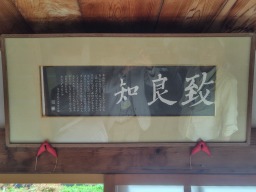 ⑬ 藤樹書院(4) 「到良知」額 「到良知」(良知に到る)について、「小説中江藤樹」で著者の童門冬二は次のように書いています。 「良知というのは人間の心の本体である。したがって、だれもが生まれた時から完全な形で保っている。…この良知はすばらしく明快で適切な働きによって人間を正しく導く。」「良知には邪魔者がある。邪魔者というのは人間の欲求の情だ。…人は心から欲求の情を取り除かなければならない。その方法としては、自分の意を誠にすること以外ない」これがすなわち、「良知に到る」ということである。 なお、額の「知」の文字が「良到」より小さくなっていることについて、「藤樹書院」の上田藤市郎先生からは、①「知」を小さくすることによって「書」として引き締まること、②「知」より「良到」が大事ということを表わしているのではないかということを伺いました。 |