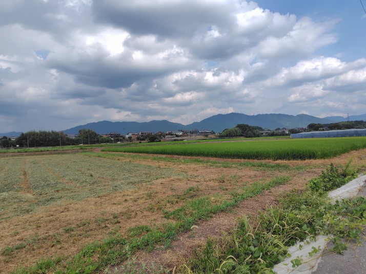 | ㉔鯰江の城全景を眺める(2) (東近江市鯰江町) ㉓の写真の右方面を撮ったものですが、鯰江の城のあった段丘崖が続いています。 ※ 写真をクリックすると拡大画像を見ることができます。 |