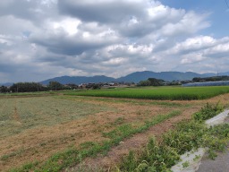 | ㉓鯰江の城全景を眺める(1) (東近江市鯰江町) 鯰江町地先愛知川右岸堤防付近の農道から北方面を眺めています。ここは、山本先生お薦めビューポイントで、後方の緑の帯が河岸段丘の段丘崖で、鯰江の城があったところです。 ※ 写真をクリックすると拡大画像を見ることができます。 |