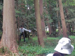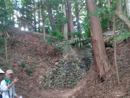 | ③井元城址(3) 二重角馬出し (東近江市妹町) ②と同じ場所を山本先生の背後から撮影した写真です。下から見上げて山本先生の話を聞くレイ大生が小さく写っており、馬出しがかなりの高さがあったのがわかると思います。 ※ 写真をクリックすると拡大画像を見ることができます。 |