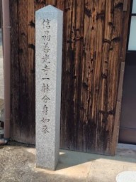 ③ 八風街道と千草街道の分岐点(3)(東近江市永源寺町如来) 分岐点の近くには「信刕(州)善光寺一躰(体)分身如来」と標された石碑があります。 山本先生から、この石碑が建つ善光寺如来堂には、石造の阿弥陀如来像が祀られており、集落名もこれにちなむことを教えていただきました。 |