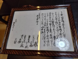 ⑫ 藤樹書院(3) 内部 藤樹書院の内部には、藤樹直筆の「到良知」の書や藤樹愛用の文机など藤樹の遺品・遺物が展示されていますが、明治の大火の際に、村人が自宅が類焼する中でも藤樹書院の重宝を持ち出して守ったそうです。また、奥の祭壇には藤樹をはじめ中江家の神主(しんしゅ。儒教の位牌)が並んでいます。 |