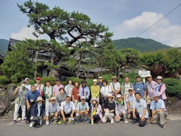 ⑪ 信長駒繋ぎの松(1)(東近江市甲津畑) 信長が千草街道を利用する際に休憩されたという速水家には、信長が馬を繫いだ「信長駒(馬)繋ぎの松」があり、その前で記念撮影を行いました。 |