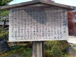 | ⑫ 信長駒繋ぎの松(2)(東近江市甲津畑) 「信長駒繋ぎの松」に掲げられた案内板には、次のように書かれています。 【勘六左衛門の松】 当家の祖先速水勘六左衛門は信長公記にもしばしば出てくるこの地方きっての郷士で、戦国時代の初期に最も活躍した。 織田信長が近江路に入るに際しその召に応じ、数々の武勲をたてている。信長はそのため近江と美濃尾張を往復のとき、たびたびこの千種街道を利用している。その際、杉峠より布施(八日市)までの間を警護したのが勘六左衛門であって、とちゅう信長はいつも当家で休憩していた。 この見事な松は信長のもっとも愛した木で、信長の馬をつないだところから、別名「信長馬つなぎの松」とも呼ばれている。 ※ 写真をクリックすると拡大画像を見ることができます。 |