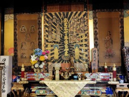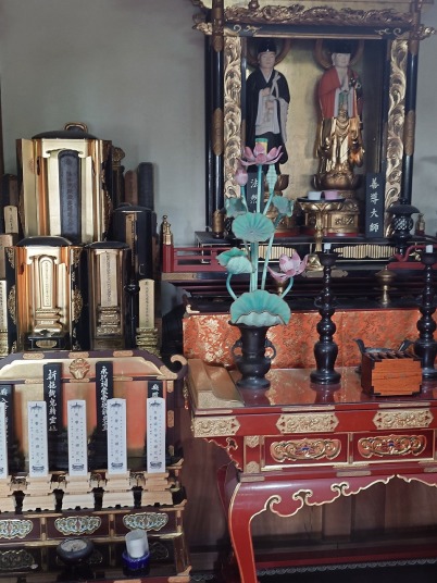 | ⑭鯰江(森村)城址(7)専修院 鯰江氏の重臣森備前守の位牌 (東近江市鯰江町) 専修院本堂に安置されている位牌のうち、ひと際大きな位牌(写真左上段)には、「陽林院殿徹叟祖大居士」、裏には「森備前守」と書かれているので、鯰江氏の重臣森村城主森備前守の位牌です。 ※ 写真をクリックすると拡大画像を見ることができます。 |