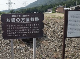 | ⑯ 高野館遺跡・お鍋の方屋敷跡(3)(東近江市永源寺高野町) 午前の講義で山本先生から、永禄12年(1569年)に南伊勢平定を将軍義昭に報告するため上洛した際などの縁で、小倉右京亮と信長の関係が成立し、この縁があだとなり右京亮が自害して妻のお鍋が信長を頼り信長の側室になったと説明していただきました。 お鍋の方屋敷跡の案内板には、次のように書かれています。 【戦国の世に翻弄された お鍋の方屋敷跡】 天正10年(1582年)6月2日本能寺の変後秀吉の正室ねねが住まわせた。お鍋の方は信長の側室で信長が安土城から本能寺に向かう時に最後まで見送ったと言われています。 ※ 写真をクリックすると拡大画像を見ることができます。 |