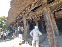 ④ 西教寺(4) 本堂廊下から客殿(重要文化財)を望む 客殿は、豊臣秀吉が初めに造営した伏見城(指月城)の御殿の一部を移築したといわれています。長谷川先生から、客殿は「桃山御殿」とも呼ばれ、桃山様式の細部を持つ書院造の建築であることなどを学びました。また、各間に描かれた障壁画や襖絵をガラス越しに見学しました。 |