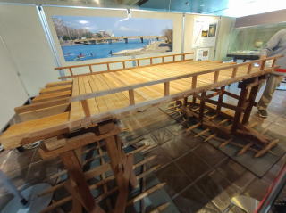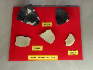 | ①近江 陸のみち・湖のみち展示 | ②関津遺跡田原道(大津市)遺物 | ③勢田橋(1/7模型)(大津市) | ④ 高野遺跡(栗東市)東海道側溝出土土器 |