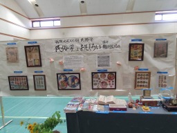 会場には先生の蔵物品の一部を拝借した、面子(めんこ)と置き薬(配置薬)の袋、クラスのメンバーが個人の人脈で手配した、ひねり独楽(ひねりごま)・手火鉢、また、クラスメンバーが保持している、明治時代の御朱印帳、ミシンや古時計などを展示しました。