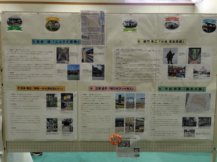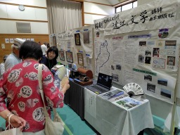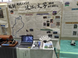 文学の展示は、旅行作家の西本梛枝先生にお教えいただいた「近江と文学」の時に、クラスメンバーが研究発表した近江を舞台とする小説の中から次の8作品を取り上げ、著者紹介、小説の舞台、あらすじ、読後感想を取りまとめて展示パネルを作成しました。模造紙の左側に琵琶湖を描き、そこにそれぞれの作品の舞台となった地点をプロットしました。また、中江藤樹に関するビデオも視聴できるようにしました。