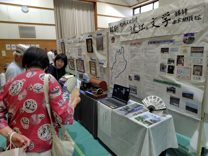 ※ 民俗学・地域学・文学展示の写真のほか、フォト・ウォーククラブや書道部の展示スペースに掲示された46期地域文化学科メンバーの作品や、46期地域文化学科のメンバーが製作に携わった近江古墳周遊会の古墳模型の写真もあります。また、「近江と文学」を教えていただきました旅行作家の西本梛枝先生が7月26日(土)に私たちの展示を見学するために来訪されましたので、先生と一緒に撮った写真もここに納めました。