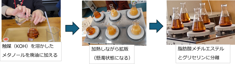 植物からバイオアルコール、バイオディーゼル(BDF)を作製、天ぷら廃油(植物油)からもBDFを作る事ができる。