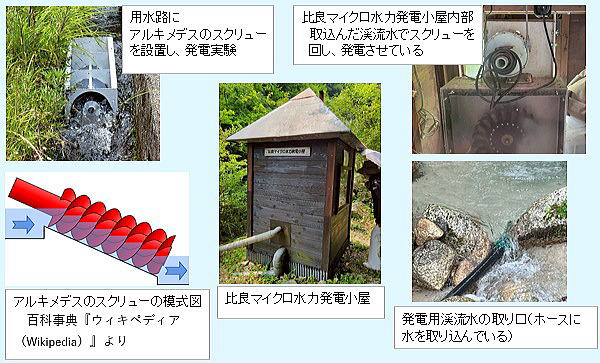 簡易な水力発電方法の見学・実習 ・青木先生の自宅で水道のホースにスクリューを取り付け、水の流れで回転させて発電→LEDライトが点灯 その他、数万円程度で水力発電できる実験機の見学 ・田んぼの用水路にアルキメデスのスクリューを設置して発電 アルキメデスのスクリューの上部に水を注ぎスクリューを回す→回転するシャフトで発電させる ・旧比良のリフト乗り場前で、渓流水を利用した発電を見学 150m上流(標高差15m)より導水管で小屋まで水を引き、毎秒1Lで発電機を動かし約100Wを発電 ![]() |