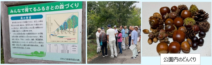 森づくりと環境~未来の子どもたちのために森をつくりましょう~ 講義と公園内の散策とどんぐり拾い ・地球温暖化の影響・適応 温暖化のメカニズム、世界各地での影響例、適応策、脱炭素社会への取組等について ・森林について(森林の役割:CO2を吸収し、O2:酸素を生成) 森林の面積推移(世界:熱帯雨林中心に減少(中国等一部は増加)、日本:66%が森林で45年間横這い) 滋賀県の森の保全や森づくりの取組みの説明(滋賀県の森林面積:県土の1/2) ・びわこ地球市民の森 野洲川南部の廃川敷地の一部42.5haを都市公園とした→46万人が16万本を植樹 市民・県民と行政(県)の協働:「市民が森を育み、森が市民を育てる」をコンセプトに 森の育成等に「森つくりサポーター」として46団体844人が参加(レイカディア大学OBも多く参加中) 自然教室開催、自然観察・体験、草花遊び、昆虫探し、クラフト作り等で、年間数万人が訪れている → 将来的にビオトープの拠点となる森づくりをしていきたいそうだ 地球温暖化対策(森によるCO2吸収)→ 年間炭素吸収量:39.1炭素㌧ ![]() ![]() |