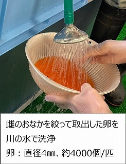 ・ニジマスの人工授精を実習。5班に分かれ各班で1匹ずつニジマスの雌から採卵し、雄の精子を授精させた。