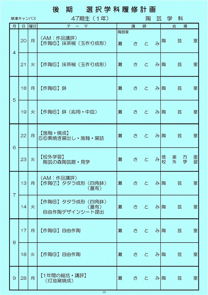 47期陶芸学科 学習内容選択講座 1年(座学、作陶Ⅰ~作陶Ⅸ) |