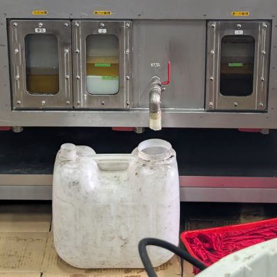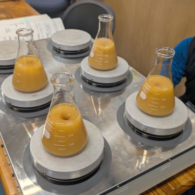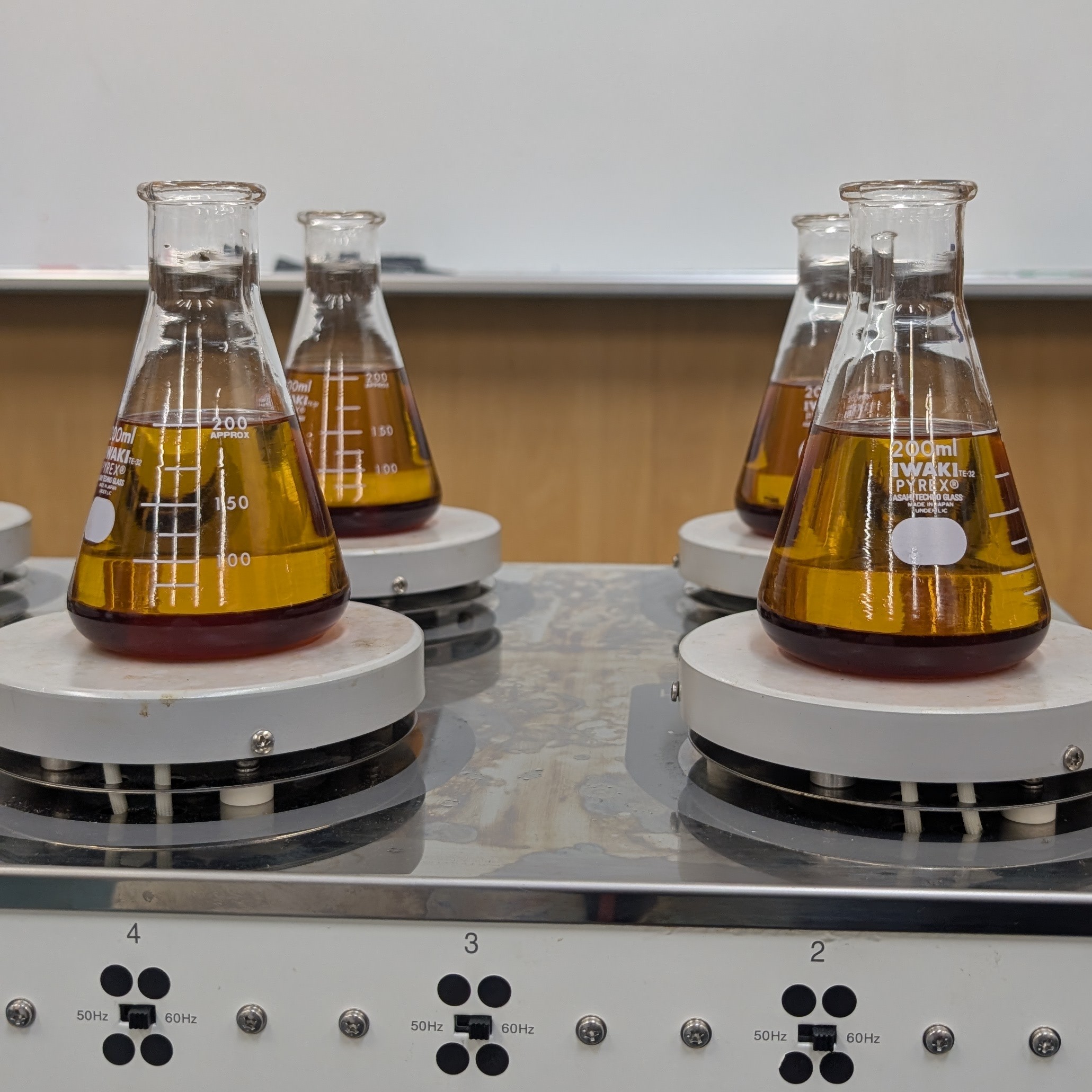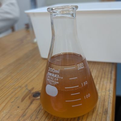 | 午後:【体験】BDF(バイオディーゼル燃料)製造実験 ・廃食油を原料にバイオディーゼル燃料を模擬的に作る (1)酸化カリウムをメタノールに入れ、まぜ棒でつぶしながら混ぜる (2)廃食油を入れ、磁石を投入 (3)実験装置上で加熱しながら約1時間攪拌 (4)静置すると上層(BDF)と下層(グリセリン、褐色)に分離 【施設見学】 (1)BDFで走るトラック (2)BDF発電機 (2)廃食油リサイクルせっけん「愛しゃぼん」製造設備 (3)お米のもみ殻をBDF燃料で着火し炭化した「もみ殻くん炭」製造設備 (4)バイオディーゼル燃料製造設備 (5)菜たね油「菜ばかり」製造設備 |